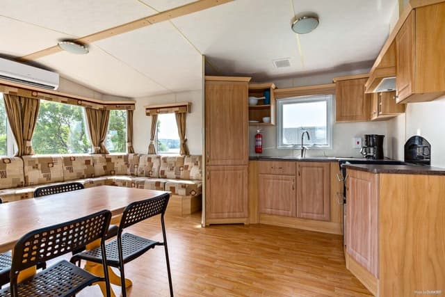 Schöner Wohnwagen, der mit seinen sechs Betten Platz für die ganze Familie bietet.