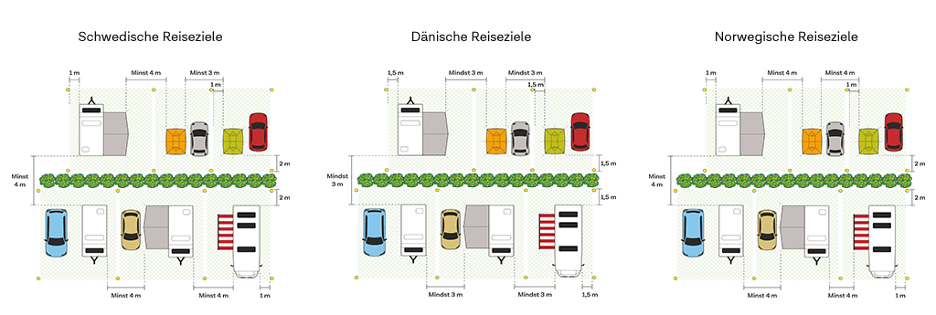 - Wohnmobile müssen auf dem gemieteten Stellplatz und gemäß dem Bild unten aufgestellt werden, um die Brandschutzbestimmungen einzuhalten, die wir erfüllen müssen (sofern vor Ort nicht anders angegeben ist). Bitte wenden Sie sich an die Mitarbeiter, wenn Sie sich diesbezüglich nicht ganz sicher sind.