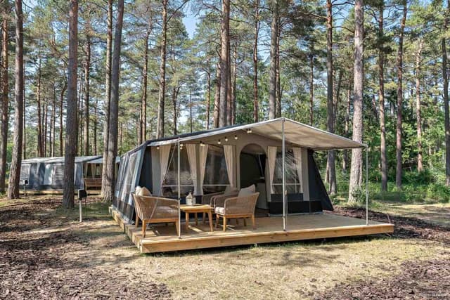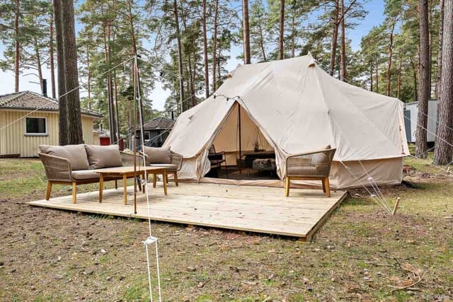 Mit Glamping genießen Sie das Beste aus zwei Welten. Das Wohnen in einem Glampingzelt verbindet ideal den Reiz des Übernachtens im Zelt mit den Annehmlichkeiten einer Hütte. Ein außergewöhnliches Zelterlebnis mit bequemen Betten und Ihrer ganz privaten Terrasse. Wenn Sie in den Glampingzelten in Åhus – Kristianstad übernachten, sind Sie mitten in der Natur, in traumhafter Lage in der Nähe des wunderschönen weißen Sandstrandes – und das Beste daran: Die Mühe, Ihr Zelt selbst aufzustellen, können Sie sich getrost ersparen.
