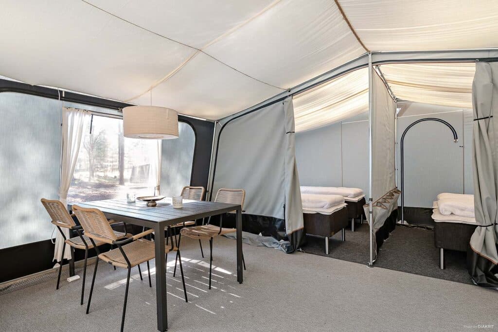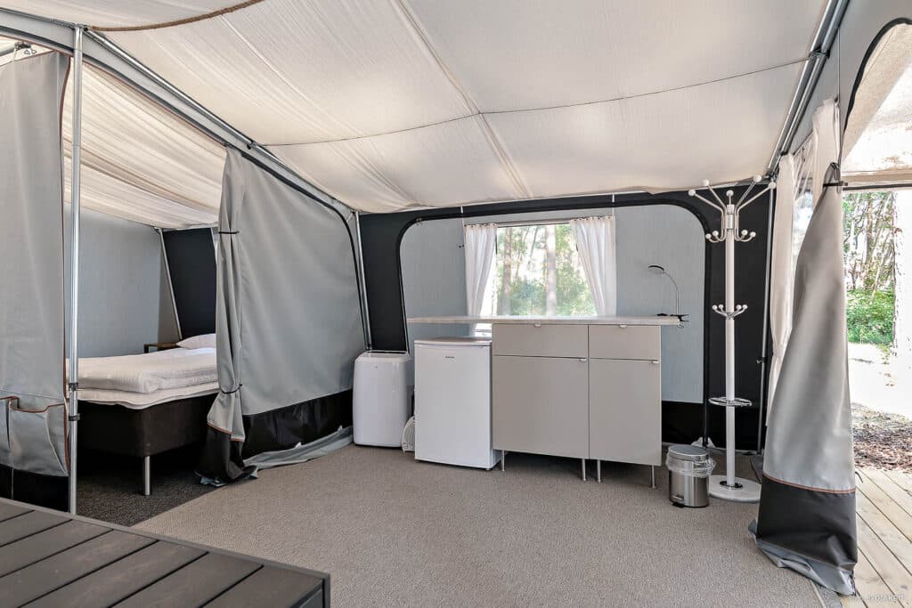 Willkommen in unseren noch brandneuen Glampingzelten! Auf 26 geräumigen Quadratmetern finden Sie alles, was Sie für einen traumhaften Zelturlaub brauchen. Unsere Glampingzelte bieten Platz für bis zu vier Personen in zwei Schlafzimmern, wobei ein Zimmer ein bequemes Doppelbett und das andere zwei bequeme Einzelbetten beherbergt. Außerhalb des Zeltes befindet sich eine wunderschön möblierte Terrasse mit 10 großzügigen Quadratmetern, von wo aus Sie das entspannende Rauschen des Windes in den Bäumen und Wiesen und die Wellen des Meeres mit einer Tasse Kaffee in der Hand oder beim abendlichen Grillen ausgiebig genießen können. Im Glamping-Bereich gibt es eine Outdoor-Küche mit Dach, sowie ein kleines Service-Gebäude mit Dusche und WC. Küchenzubehör, Kühl- und Gefrierfach sowie Geschirr befinden sich bereits im Glampingzelt.