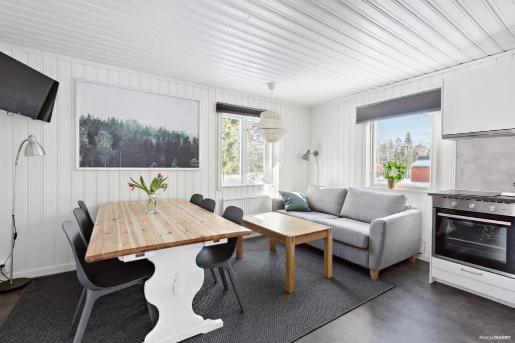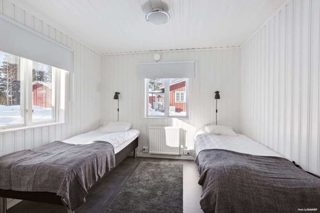 Die Falkastuga ist eine unserer größten Hütten mit ganzen 57 Quadratmetern. Perfekt für den Familienurlaub oder das Abenteuer mit Freunden. Die sechs Betten der Hütte sind auf drei Schlafzimmer mit Einzelbetten verteilt, zwei weitere Schlafplätze befinden sich im Wohnzimmer auf dem Schlafsofa. Die voll ausgestattete Küche bietet dir alles, was du brauchst, um eigene Mahlzeiten einfach zuzubereiten. Im gemütlichen Wohnbereich gibt es reichlich Platz für entspannte Abende vor dem Fernseher oder einfach zum Ausruhen. Dort befindet sich auch ein Esstisch mit Platz für 6 Personen, an dem ihr gemeinsam essen könnt. Im Badezimmer stehen dir sowohl Dusche als auch Toilette zur Verfügung. Eine Sauna ist in Hütte Nr. 18 vorhanden. Haustiere sind ebenfalls herzlich willkommen.