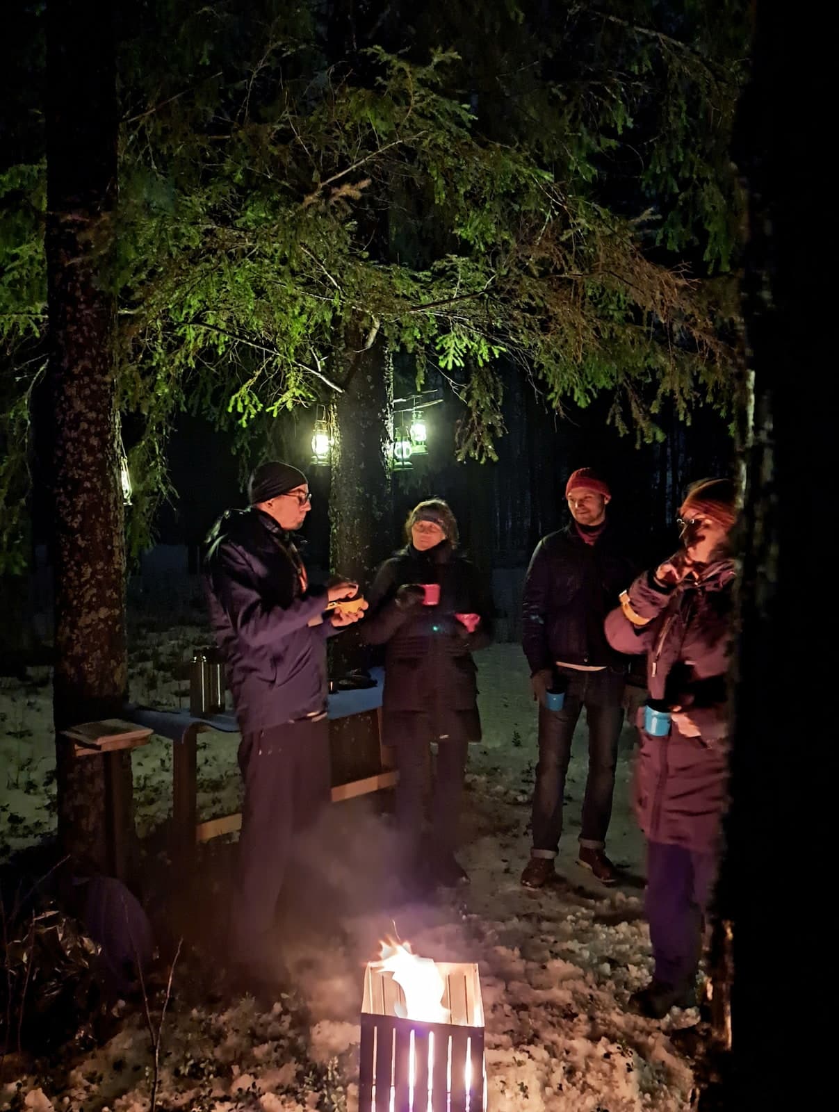 Die Wanderung führt weiter durch den Wald zu einem ruhigen Platz, an dem wir uns an einem offenen Feuer versammeln. Hier werden warme Getränke und eine kleine süße Stärkung serviert, während die Geschichten in der nordschwedischen Abendstimmung weitergehen.