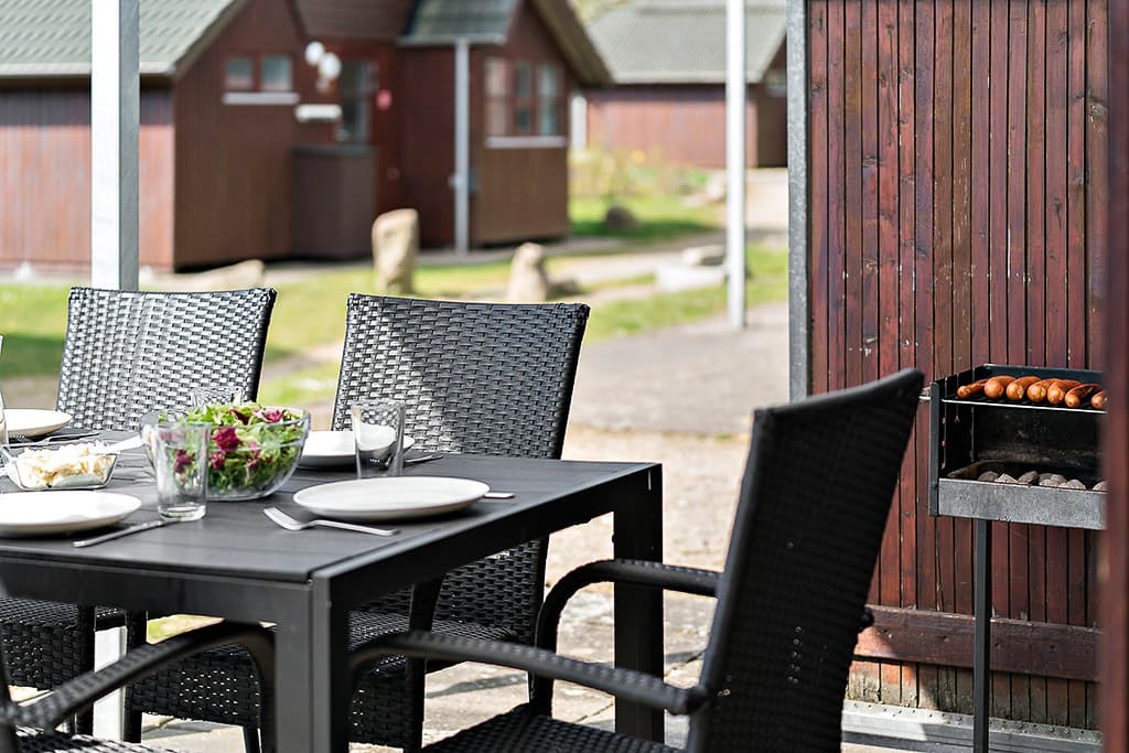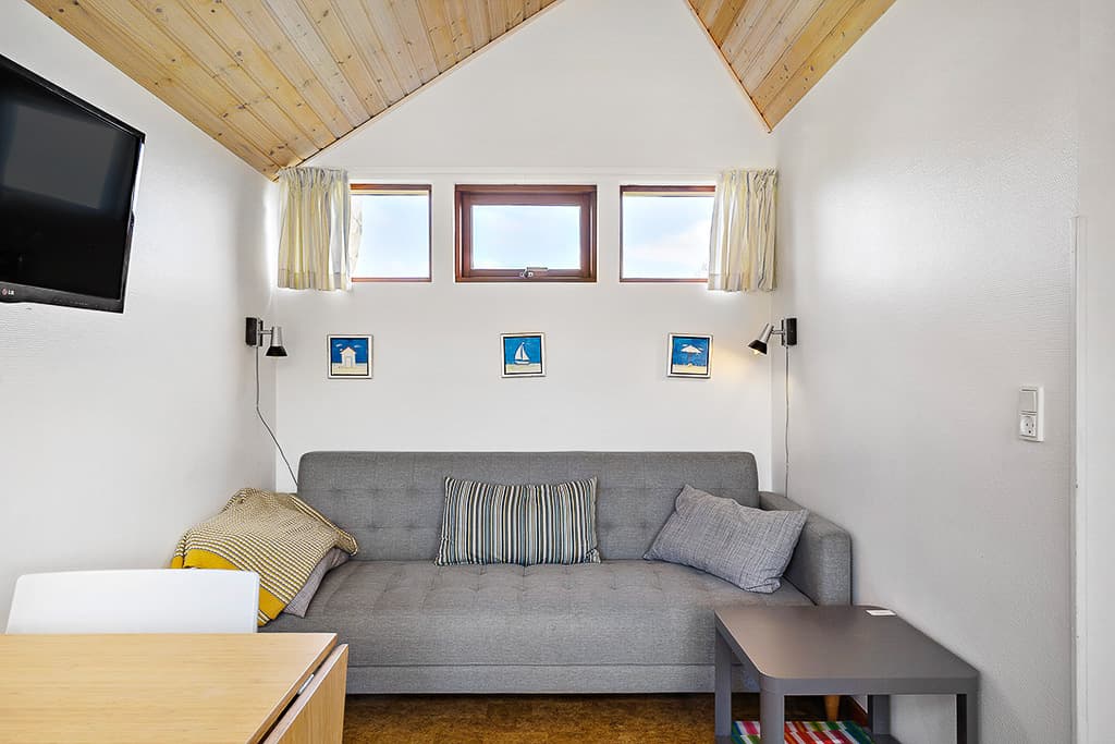 Die Hütten sind für 5 Personen ausgelegt (4 normale Betten + 1 Zustellbett im Wohnzimmer) und sind Nichtraucherkabinen. Die Hütten sind 25 m² groß und verfügen über eigene Toilette und Bad, separates Schlafzimmer und Dachboden mit Blick auf die Sterne. Die Hütten haben ein schönes, geräumiges Wohnzimmer, eine große Küche. Vollständiges Geschirr, warmes und kaltes Wasser, 4 Kochplatten, Backofen, Kühlschrank mit Gefrierfach, Geschirrspüler, Kaffeemaschine und TV. Auf der schönen überdachten Terrasse mit guten Windschutzverhältnissen finden Sie Gartenmöbel und einen Grill. Leichte Bettdecken und Kissen sind in der Kabine vorhanden. Die Kollund-Hütten wurden 2020 renoviert, unter anderem mit neue größere Küche. Kabinenpreise sind inkl. Strom, Wärme und Wasser. Ganzjährig zu vermieten!