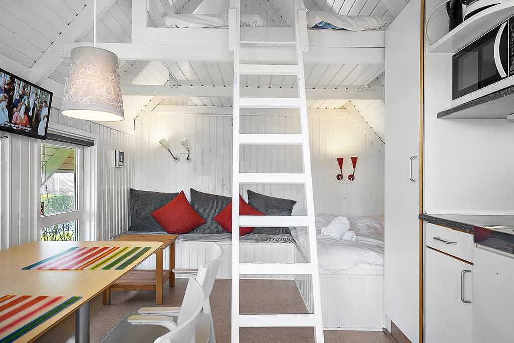 Super gemütliche Hütten mit Dachboden, Essbereich, Sofaanordnung, die auch Schlafplatz für 2 Personen ist. TV, Küchennische mit 2 Kochplatten, Mikrowelle, Kühlschrank mit Gefrierfach, Kaffeemaschine, alles in Geschirr und heißem und kaltem Wasser am Wasserhahn. Die Kabinen sind rauchfrei. Auf der schönen Terrasse finden Sie Gartenmöbel und einen Grill. Leichte Bettdecken und Kissen sind in der Kabine vorhanden.