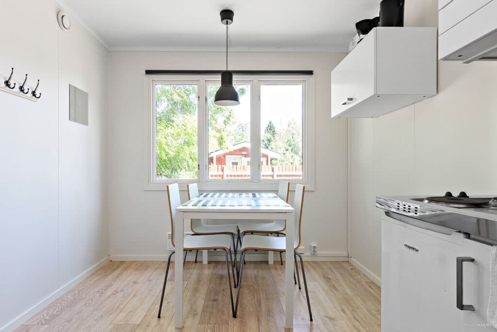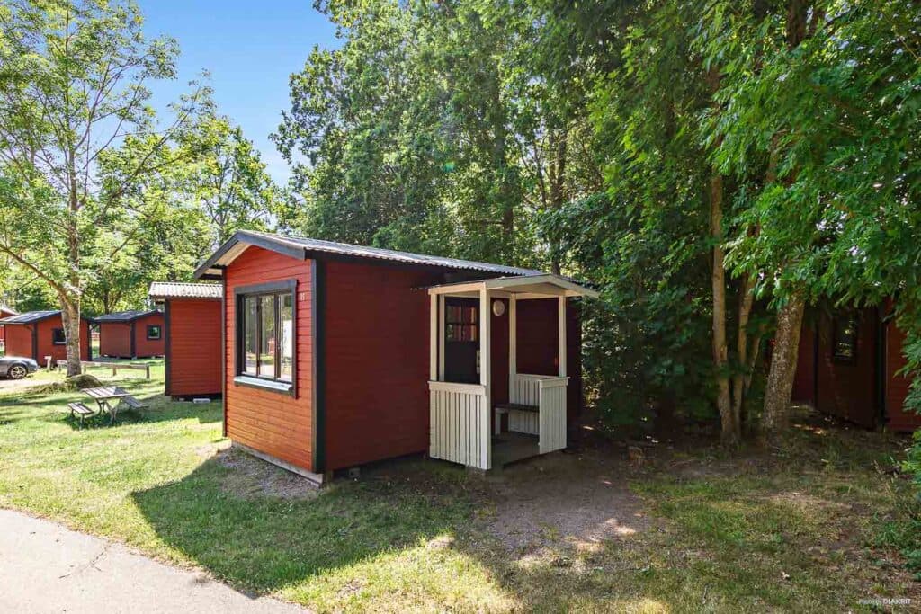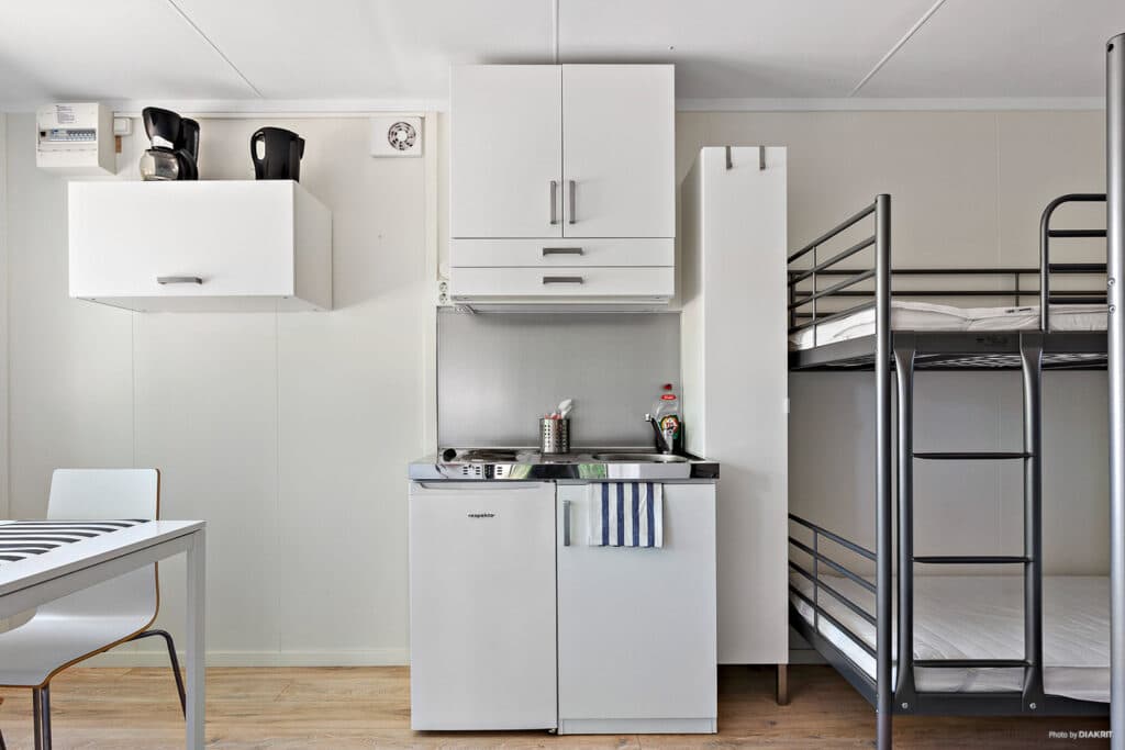4 m² Camping-Hütte mit 4 Betten. Ein großes Zimmer mit Etagenbett, Essecke und Küchenzeile. Nur „Sommerwasser“ (Kaltwasser, nur während der Sommersaison). Zugang zu den Duschen und Toiletten befindet sich in den Servicehäusern des Campingplatzes.