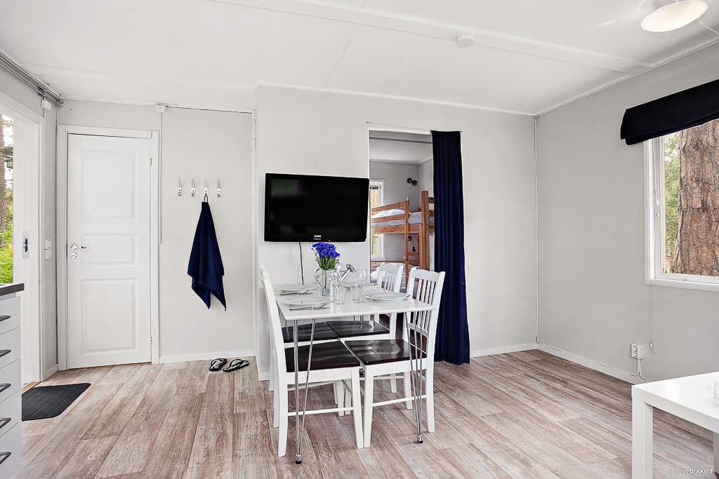 Die Tallstuga ist eine sehr gemütliche Hütte mit 25 qm. Einige Hütten liegen am Meer in der Nähe des Badeplatzes, andere in grüneren, bewaldeten Bereichen des Campingplatzes. Hier genießen Sie einen ruhigen und erholsamen Urlaub in diesen Hütten für insgesamt vier Personen. Im Inneren der Hütte finden Sie ein helles und einladendes kombiniertes Wohn- und Esszimmer mit Sitzgelegenheit für vier Personen, TV sowie ein Schlafsofa. Die Küche ist mit Kühlschrank, Gefrierfach, Herd, Backofen und Mikrowelle ausgestattet. Im Schlafzimmer der Hütte befinden sich zwei Einzelbetten, und Decken sowie Kissen sind für alle Schlafplätze vorhanden. Im hellen Badezimmer gibt es eine Dusche sowie eine Toilette.