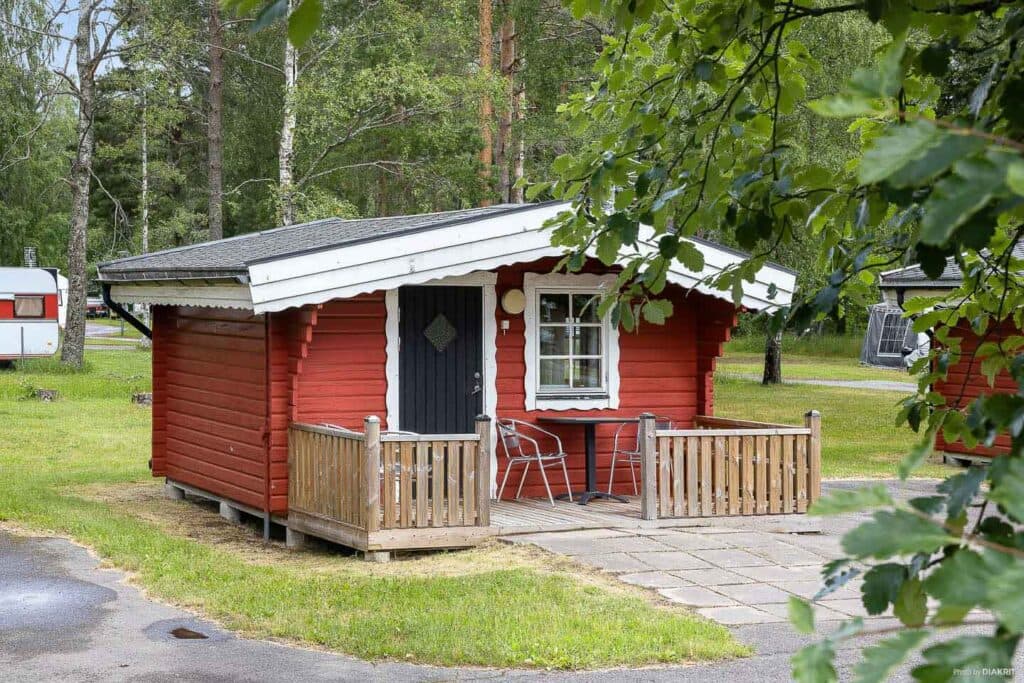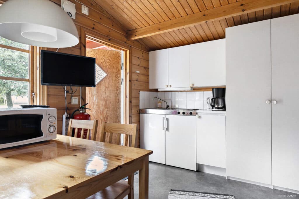 Hier handelt es sich um eine kleine, gemütliche Hütte mit Platz für bis zu vier Personen. Die Hütte ist 15 m² groß und die Schlafplätze sind auf zwei Etagenbetten verteilt, die sich im Wohnraum befinden. In der Hütte gibt es eine Pantryküche mit einfacher Küchenausstattung, Kühlschrank, Mikrowelle und Kaffeemaschine. Vor der Hütte befindet sich eine schöne Terrasse mit einem Tisch und Stühlen – perfekt für alle, die ihren Morgenkaffee oder eine Mahlzeit draußen in der herrlichen Umgebung genießen möchten.