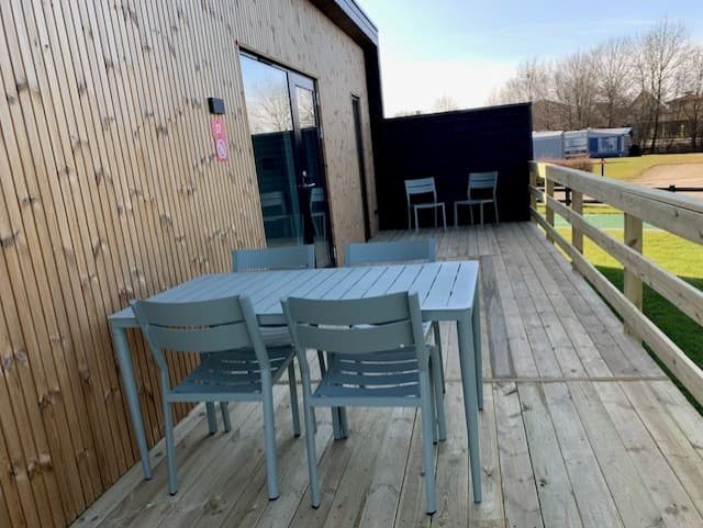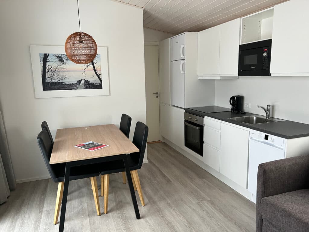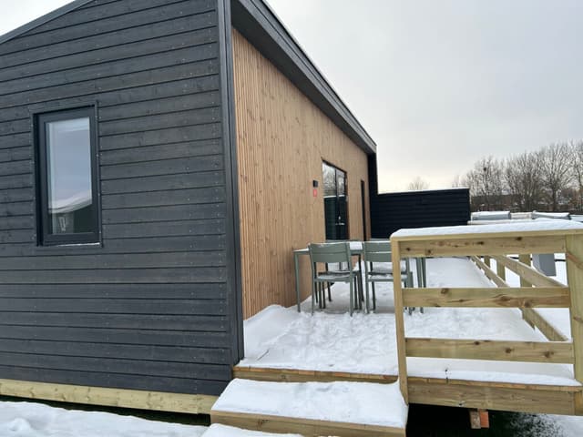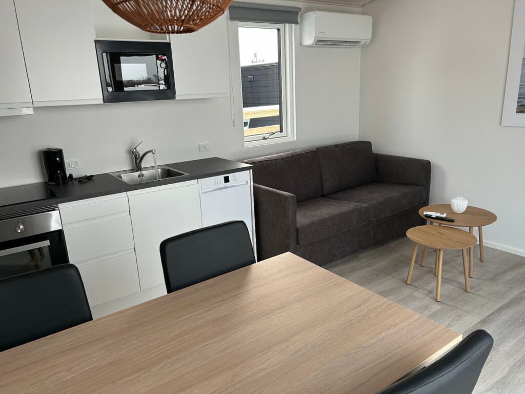 Im Wohnraum findest du eine voll ausgestattete Küche mit Geschirr, Backofen, Induktionskochfeld, Mikrowelle, Kühlschrank, Gefrierfach und Geschirrspüler. Außerdem gibt es ein Sofa und einen Fernseher mit Chromecast – perfekt für gemütliche Stunden zusammen. Draußen erwartet dich eine schöne Terrasse, auf der du deinen Morgenkaffee genießen oder einfach einen Moment entspannen kannst. Die Hütte hat natürlich auch ein eigenes Bad und WC. Für extra Komfort ist sie mit einer Luft-Luft-Wärmepumpe mit Klimaanlage ausgestattet, sodass du das ganze Jahr über ein angenehmes Raumklima hast.
