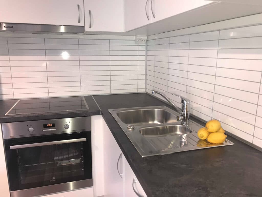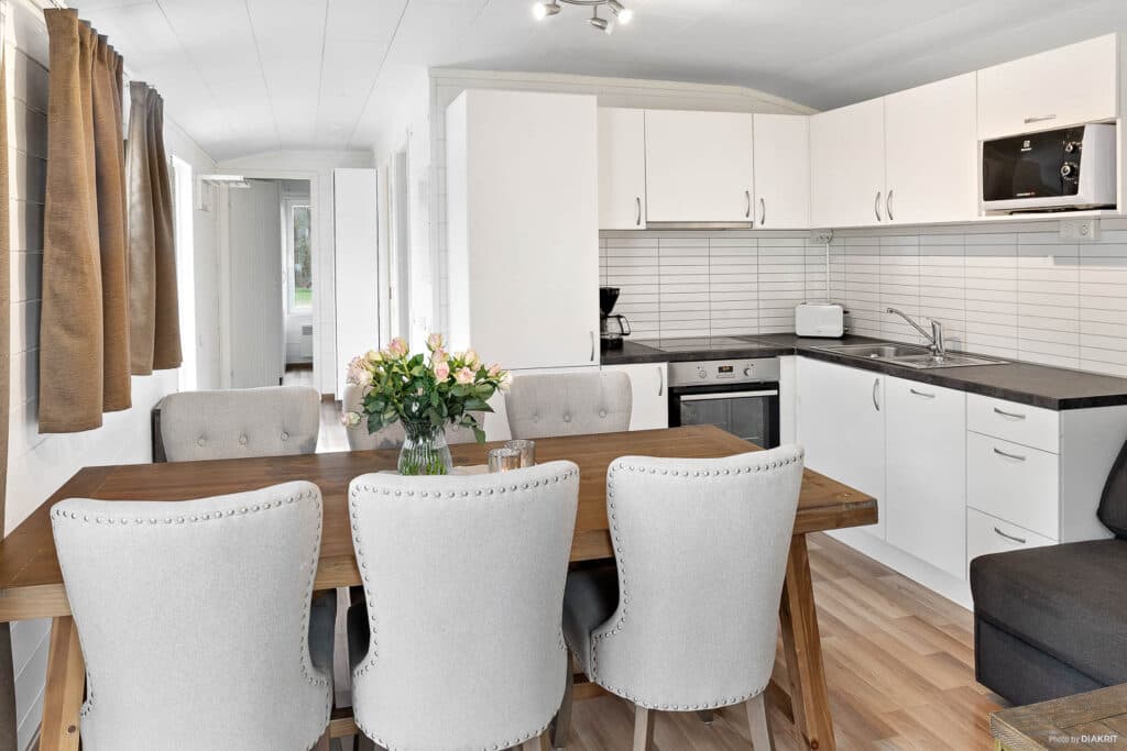 Moderne Selbstversorgerhütte mit 6 Betten in hellen Farben. Beliebte Hütte mit Familienzimmer mit Doppelschlafsofa, Essbereich für 6 Personen und TV.