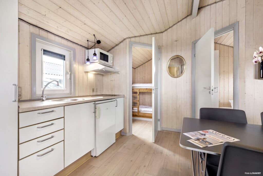 2 Zimmer, 1 mit 120 x 200 bett – 1 mit Etagenbett. Ideal für 2 Erwachsene und 2 Kinder. Familienzimmer Küche mit voll ausgestatteter Küche für 6 Personen, Kühlschrank, Herd, Esstisch, Flachbildfernseher und Schlafsofa für bis zu 2 Personen. Es gibt Bettdecken und Kissen für 6 Personen und Bettwäsche kann gemietet oder mitgebracht werden. Darüber hinaus gibt es ein eigenes Badezimmer mit Toilette/Badewanne und draußen eine kleine Terrasse mit Tisch und Stühlen, wo Sie den Blick auf den Sonnenuntergang genießen können.
