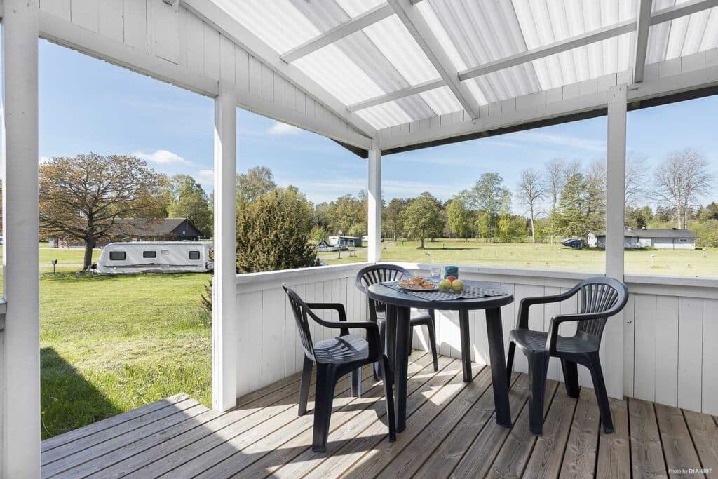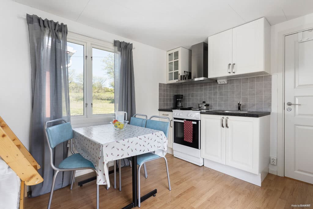Kleine und gemütliche Hütte mit allen wichtigen Annehmlichkeiten. Etagenbett mit 140 cm breiter unterer Schlafkoje und 80 cm breiter oberer Schlafkoje. Kissen und Decken stehen zu Verfügung. Voll ausgestattete Küche mit Kühlschrank und Gefrierschrank, Mikrowelle, Herd mit Backofen und Kaffeemaschine. Eigenes WC mit Dusche. Überdachte Veranda mit einfachen Gartenmöbeln für angenehme Sommerabende.
