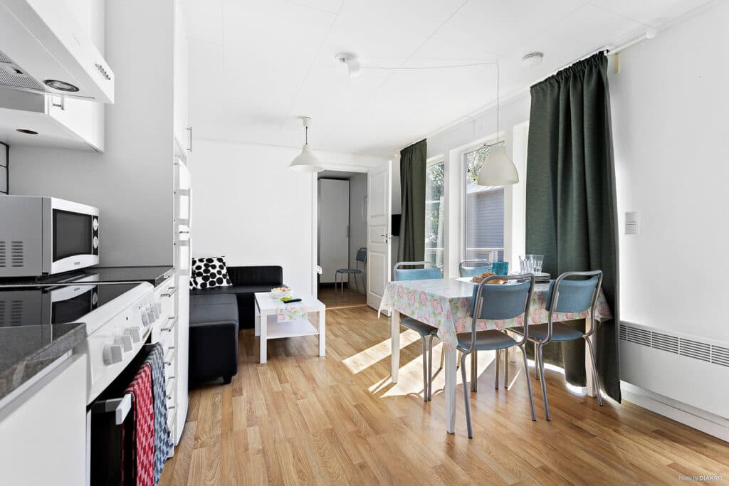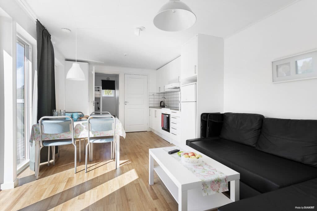 Gemütliche Hütte für die Familie oder eine Gruppe von Freunden, aufgeteilt in zwei separate Schlafzimmer, ein Zimmer mit einem Doppelbett und ein Zimmer mit einem Etagenbett. Kissen und Decken stehen zu Verfügung. Große, bodentiefe Fenster sorgen für ein lichtdurchflutetes und luftiges Wohnzimmer, in dem man sich gerne zum geselligen Beisammensein trifft. Hier stehen Ihnen ein Fernseher und ein Schlafsofa für zwei Personen zur Verfügung. Voll ausgestattete Küche mit Kühlschrank und Gefrierschrank, Herd mit Backofen, Mikrowelle und Kaffeemaschine. Eigenes WC mit Dusche. Veranda, 18 m², mit Gartenmöbeln für stimmungsvolle Abende.