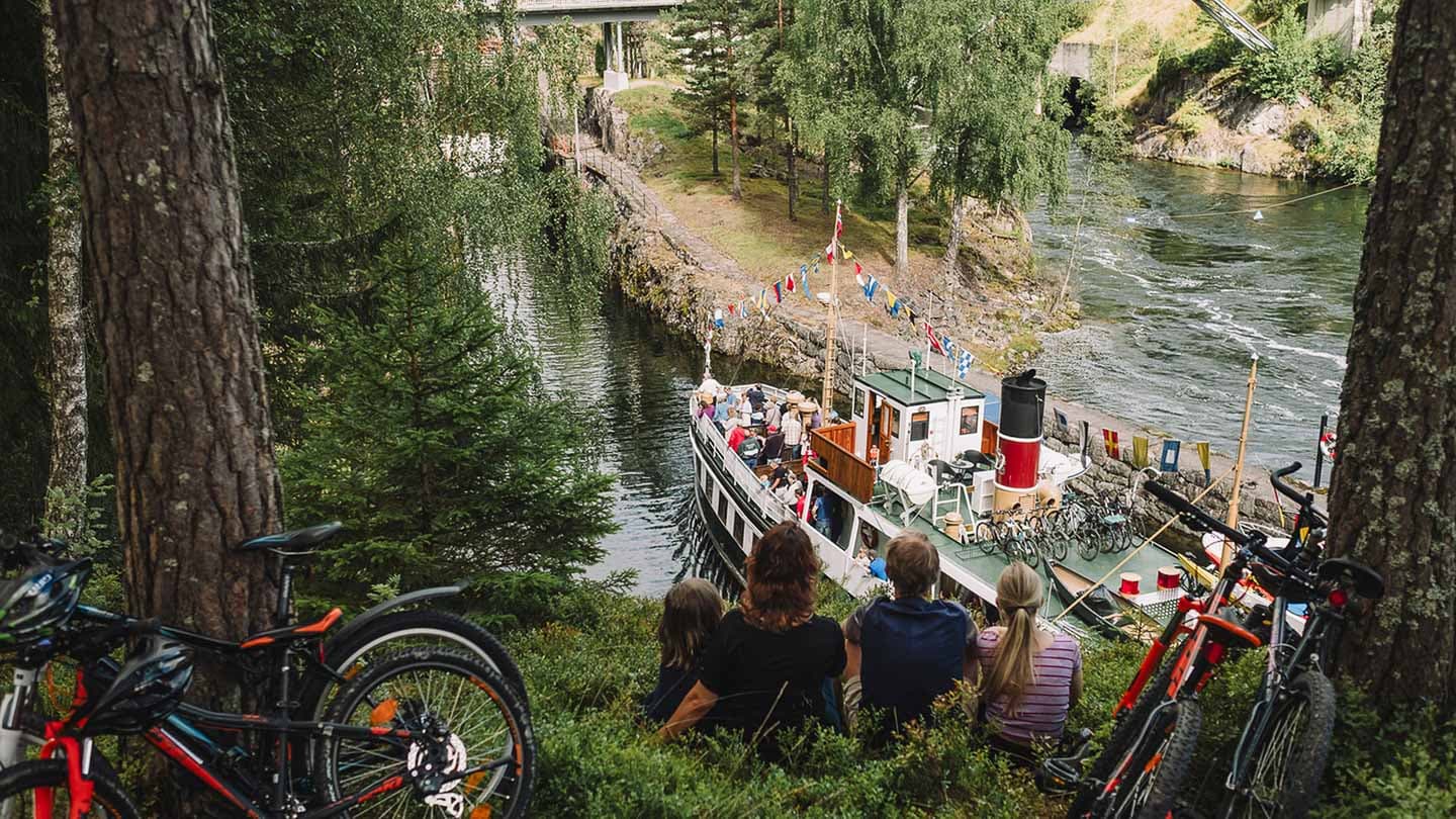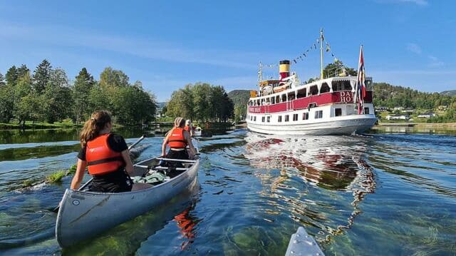 Die Kanalboote verkehren zwischen Dalen, Skien und weiteren Haltestellen (Saison: Mai/Juni–September). Fahrräder können mitgenommen werden – am besten vorher über telemarkskanalen.no reservieren. Bei Spontanbuchungen („Drop-in“) gelten angepasste Preise für kurze Strecken, sofern Platz ist.