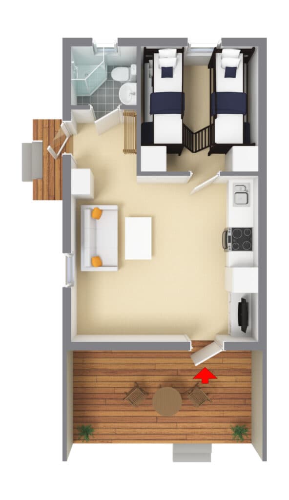 Diese Ferienhäuser haben 30 qm und sind für 6 Personen ausgelegt. Hier gibt es eine Toilette, Dusche und einen Fernseher. Ausserdem ist das Ferienhaus mit einer Küche mit 4 Kochplatten, Microwelle, Kühlschrank und Kaffeemaschine ausgestattet. Zwei Stockbetten und ein zweier Bettsofa gehören ebenfalls zur Ausstattung.