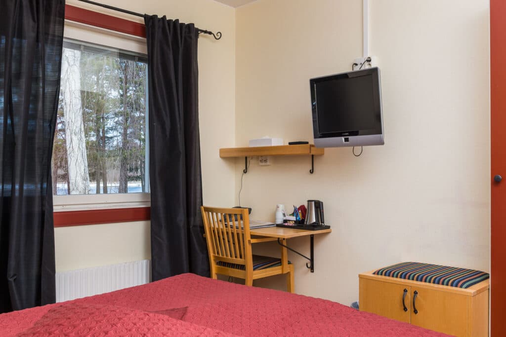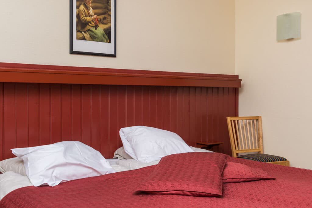 Doppelzimmer im Hotel. Im Zimmer gibt es zwei wie ein Doppelbett nebeneinander stehende Einzelbetten. Das Zimmer ist mit Wasserkocher, Bügeleisen und Bügelbrett ausgestattet, Bettwäsche und Handtücher sind inklusive. Badezimmer mit Dusche, Toilette und Föhn. Fernsehprogramme: SVT1, SVT2, TV3, TV4, Kanal5, TV6, Viasat Sport und Barnkanalen. Frühstück, Bettwäsche und Zimmerreinigung sind inklusive.