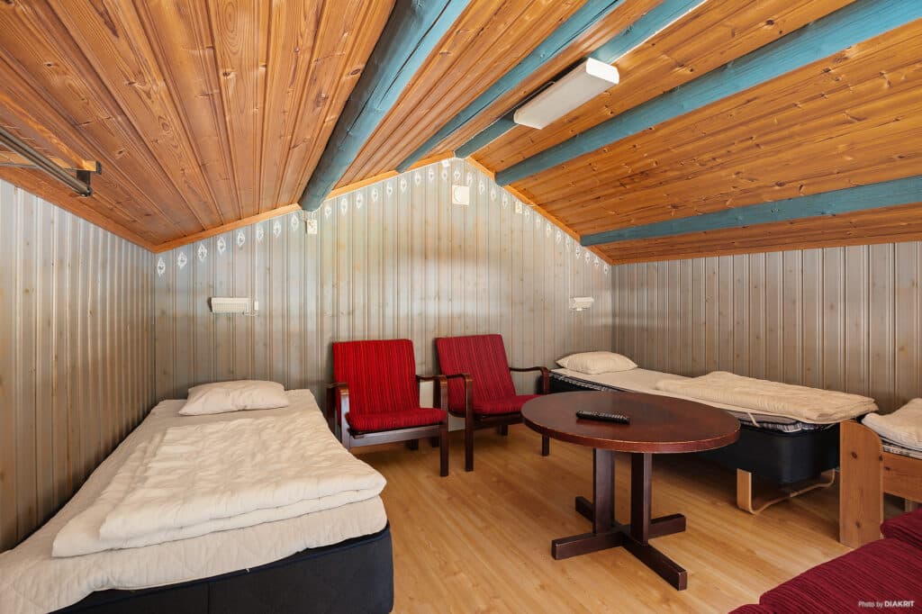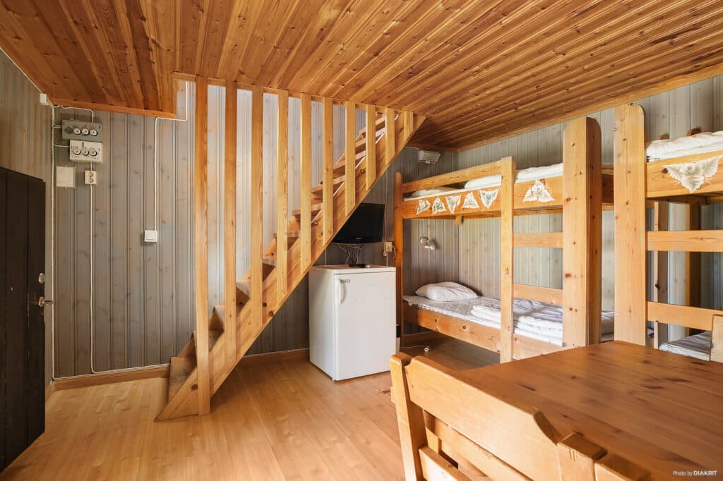 Die Moratorp ist eine Hütte im Stil von Dalarna mit insgesamt sieben Betten auf 30 m2. Die Hütte hat zwei Stockwerke mit drei Betten im oberen Stockwerk und vier im Erdgeschoss, es gibt sowohl Stockbetten als auch normale Einzelbetten. Bettdecken und Kissen sind für alle Betten der Hütte vorhanden. In der Hütte gibt es einen Essbereich mit Tisch und Stühlen. Toilette, Dusche und Küche gibt es in der Hütte nicht. Diese Dinge finden Sie im Servicegebäude nebenan. Küchenutensilien müssen mitgebracht werden, in der Hütte gibt es einen Kühlschrank. Beachten Sie, dass die Hütte eine hohe Treppe und eine niedrige Tür hat.