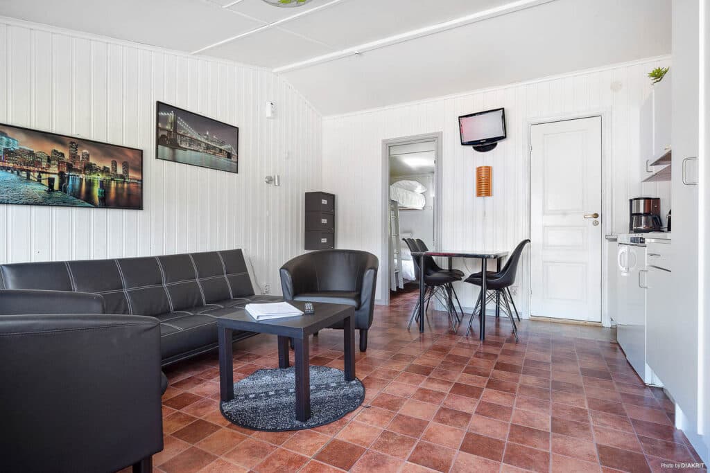 4+2 Betten. Schlafkabine mit zwei Etagenbetten, Bettsofa für zwei Personen im Anschluss an die Küche. Mikrowelle, Kaffeemaschine und TV. Geschirr für sechs Personen. Dusche und Toilette. Decken und Kissen. Veranda mit Gartenmöbel für vier Personen.