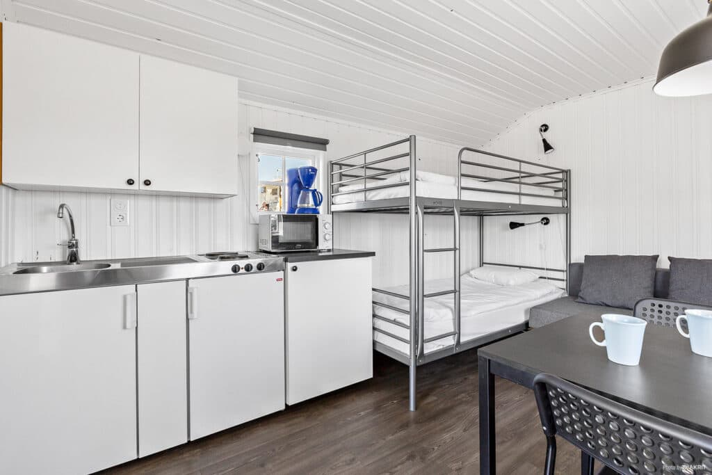 auf 17 m² bestehen aus entweder aus 2 Stockbetten oder aus einem Schlafsofa und Stockbett. Die Ferienhäuser haben eine eingebaute Kochnische und Toilette, Duschen finden Sie im Waschhaus vor. Bitte beachten Sie, dass der Die Kühlschränke in den Kabinen 1 und 5 sind etwas kleiner.