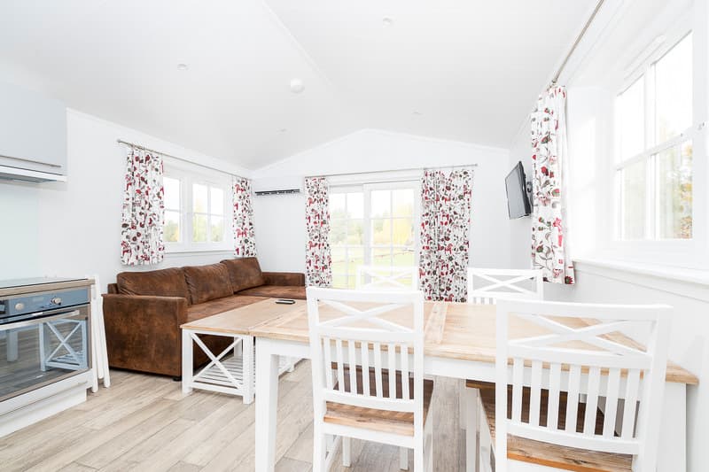 Mit 48 m2 bietet die Hansjöstuga Plus ausreichen Platz für kleine und große Familien. In diesen Strandhütten können insgesamt sechs Personen wohnen, verteilt auf zwei Schlafzimmer mit zwei Einzelbetten bzw. einem Stockbett sowie ein Schlafsofa im Wohnzimmer. Geräumige Küche mit einfacheren Küchenutensilien, Perkolator, Kühlschrank, kleinem Tiefkühler, Ofen und Mikrowellenherd. Zur Küche hin offenes Wohnzimmer mit Sofa und Fernseher. In jeder Strandhütte ist eigenes WLAN installiert. Hier gibt es eine möblierte Terrasse mit schönem Blick auf den Orsasee.