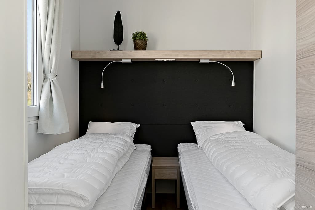 Modernes Ferienhaus zur Selbstverpflegung mit 5 + 1 Betten. Ein Schlafzimmer mit Doppelbett und ein Schlafzimmer mit zwei Einzelbetten. Wohnzimmer mit Schlafsofa für eine Person, zusätzliches Zeltbett für zusätzliche Betten neben dem Sofa, Essbereich und voll ausgestattete Küche mit Kühlschrank / Gefrierfach, Herd / Backofen, Mikrowelle und Kaffeemaschine. Badezimmer mit Dusche und WC ist vorhanden. Fußbodenheizung und Klimaanlage. Es ist möglich, Bettwäsche und Endreinigung zu kaufen. Buchbar das ganze Jahr.