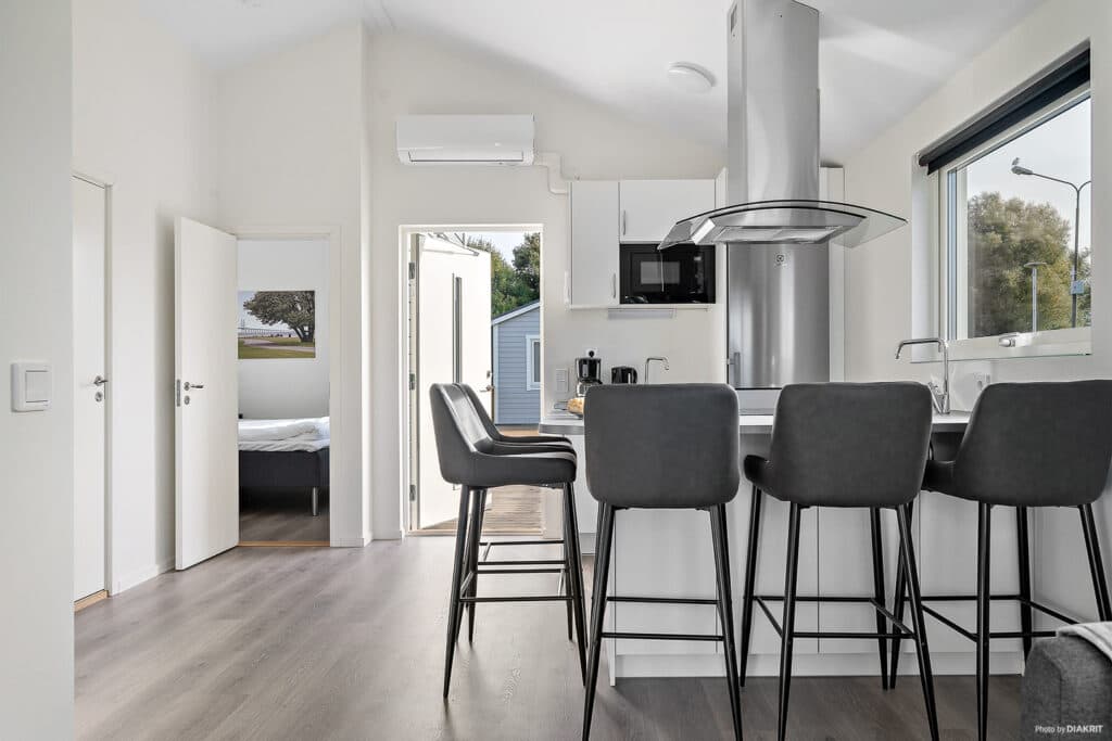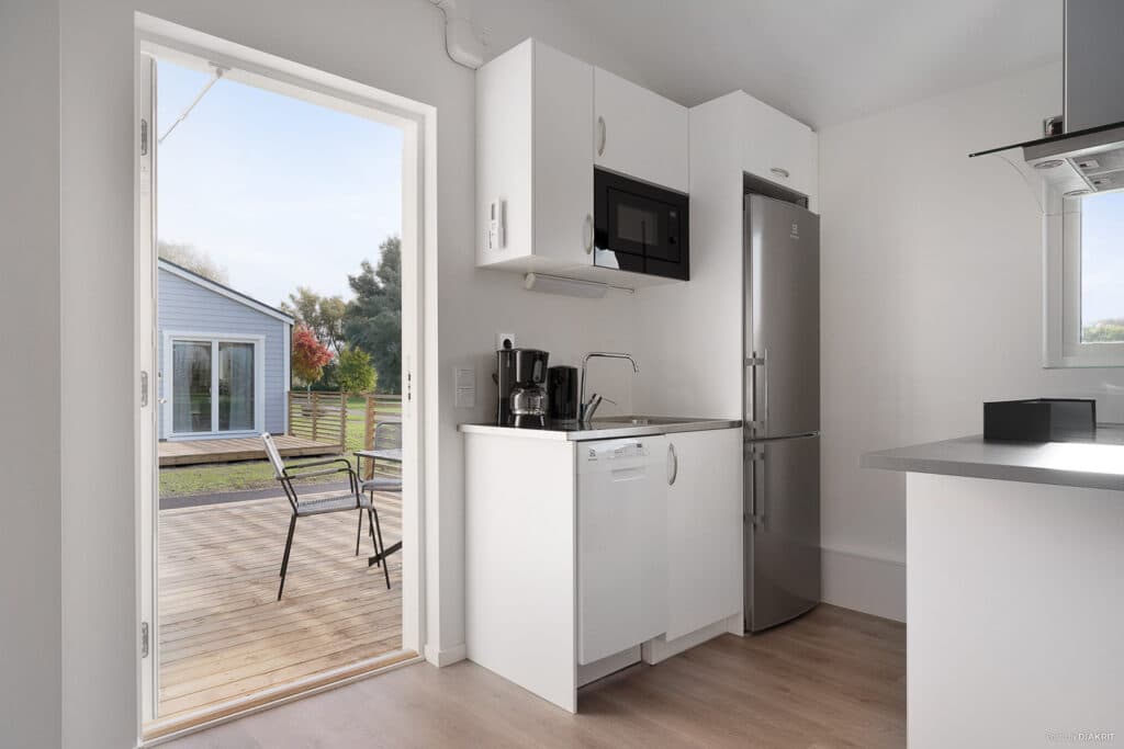 Willkommen im Ferienhaus Bunkeflo! Hier wohnen Sie in einem hellen und offen gestalteten 40 qm großen Häuschen. Die möblierte Terrasse lädt nach einem ausgiebigen Campingtag zum geselligen Beisammensein ein. Das Ferienhaus verfügt über zwei Schlafzimmer, eines mit Doppelbett und eines mit zwei Einzelbetten. Im Wohnzimmer befindet sich ein Schlafsofa, auf dem zwei weitere Personen bequem schlafen können, sodass für bis zu sechs Personen Platz ist. Die voll ausgestattete Küche verfügt über einen Herd, Backofen, Kühl- und Gefrierschrank, eine Mikrowelle und eine Kaffeemaschine. Das Ferienhaus ist zudem mit einem Fernseher ausgestattet. Ein Badezimmer ist mit Dusche, WC sowie Washmaschine im Ferienhaus vorhanden. Parkplätze stehen direkt neben dem Ferienhaus zur Verfügung. Einige der Ferienhäuser haben einen schönen Blick auf die Öresundbrücke. Die Terrasse kann auch im Winter genutzt werden. Hierfür steht jedoch nur eine Garnitur Terrassenmöbel bereit.