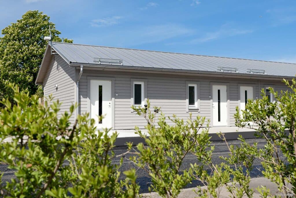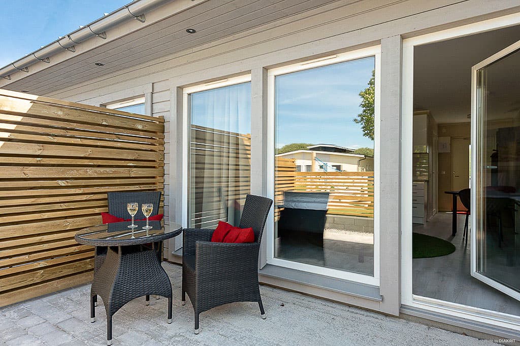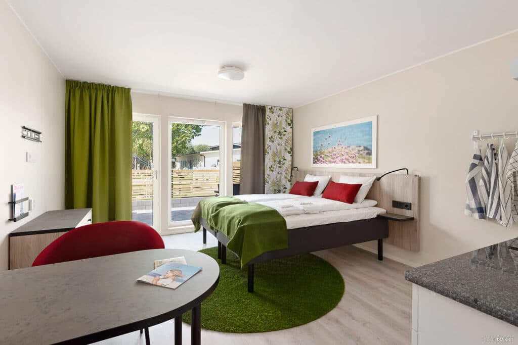 Unsere modernen 26 qm großen Studios sind mit Küche und Badezimmer ausgestattet und werden wie ein Hotelzimmer vermietet, d. h. die Betten sind bezogen und alles ist für Ihren nächsten Besuch bereit. Mit eigenem Eingang und Terrasse haben Sie alle Freiheiten eines Ferienhauses und den Standard eines Hotelzimmers und wohnen komfortabel nahe der Stadt und der Natur. Die Küchenzeile ist mit Kochfeld, Kühlschrank, Mikrowelle und Kaffeemaschine ausgestattet. Es ist ein Essplatz für zwei Personen sowie ein Fernseher vorhanden. Dank bodentiefer Fenster ist der Raum herrlich lichtdurchflutet. Das Badezimmer hat Dusche und Toilette.