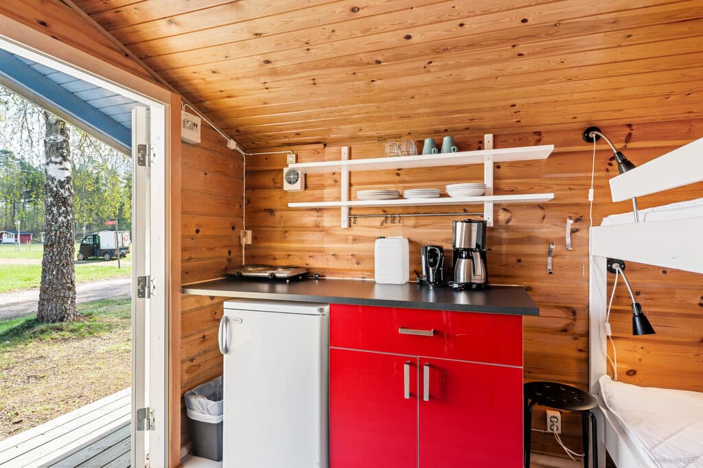 Lundbytorp befindet sich in einem ruhigeren Bereich des Campingplatzes, etwas weiter von der Rezeption und dem Eingang entfernt. Es handelt sich um eine kleinere Hütte mit 12 m² und vier Schlafplätzen, verteilt auf zwei Etagenbetten à 80 cm. Zu jedem Bett gehören Matratze, Decke und Kissen. Die Hütte ist mit einem Esstisch und Stühlen eingerichtet. Die Küche verfügt über einen Kühlschrank, zwei Kochplatten, zwei Kochtöpfe sowie das wichtigste Küchenzubehör und Geschirr für vier Personen. Wenn du eine Bratpfanne brauchst, kannst du dir gerne eine an der Rezeption ausleihen. Es gibt kein fließendes Wasser in der Hütte, aber einen Wasserkanister und eine Spülschüssel. Dusche, Toilette und eine größere Küche befinden sich in den Gemeinschaftsgebäuden auf dem Gelände. Haustiere sind in dieser Hütte erlaubt.
