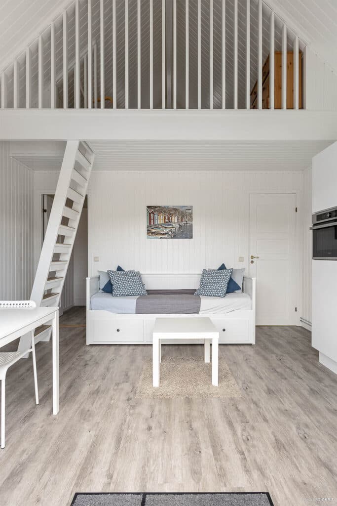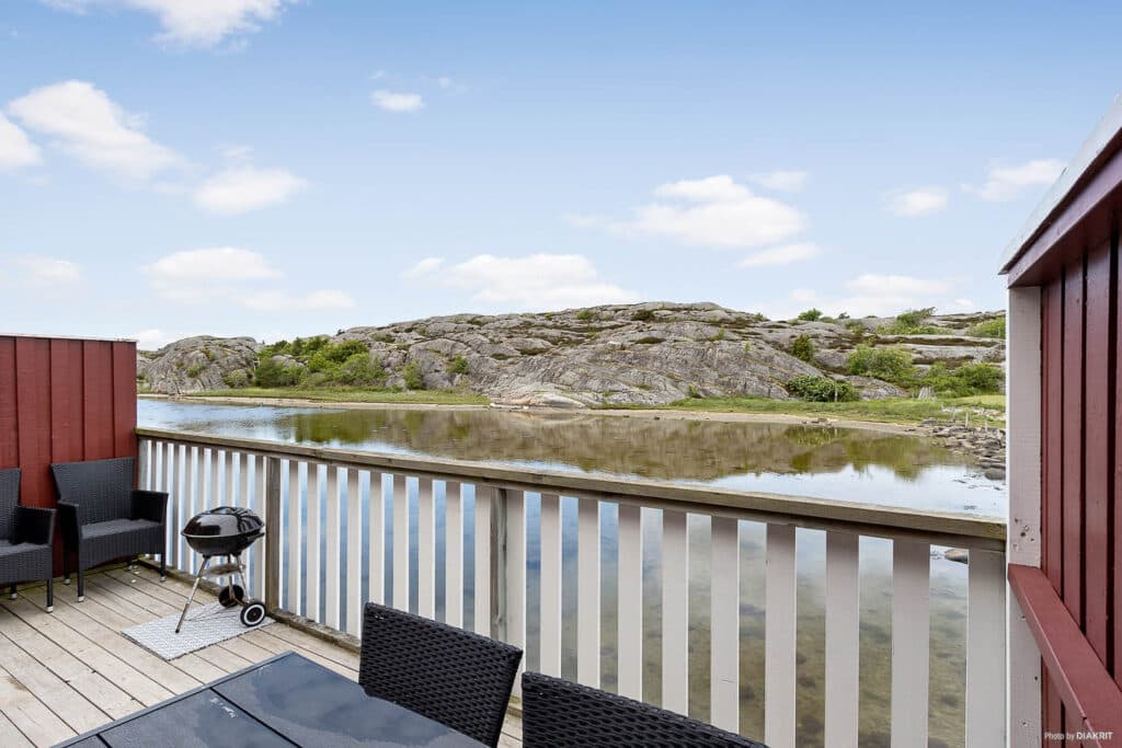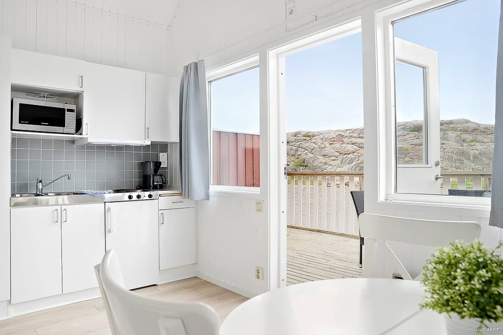 Im Haus Strandbyn wohnen Sie in bester Lage direkt am Wasser. Perfekt für alle, die das ultimative Schärenfeeling von Kungshamn und Smögen erleben wollen. Die Häuser inklusive Loft bieten 36 qm Wohnfläche und insgesamt sechs Schlafgelegenheiten: ein Etagenbett im separaten Schlafzimmer, ein Schlafsofa im Wohnbereich und zwei Einzelbetten im Loft. Für alle Betten liegen Decken und Kissen bereit. Das Badezimmer hat Dusche und Toilette. Die Küche ist mit Herd, Mikrowelle, Kühl- und Gefrierschrank ausgestattet, und auch ein Fernseher ist vorhanden. Auf der sage und schreibe 16 qm großen Terrasse finden Sie Ihren ganz persönlichen Platz an der Sonne. Ihren Pkw parken Sie neben dem Haus.