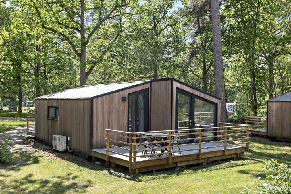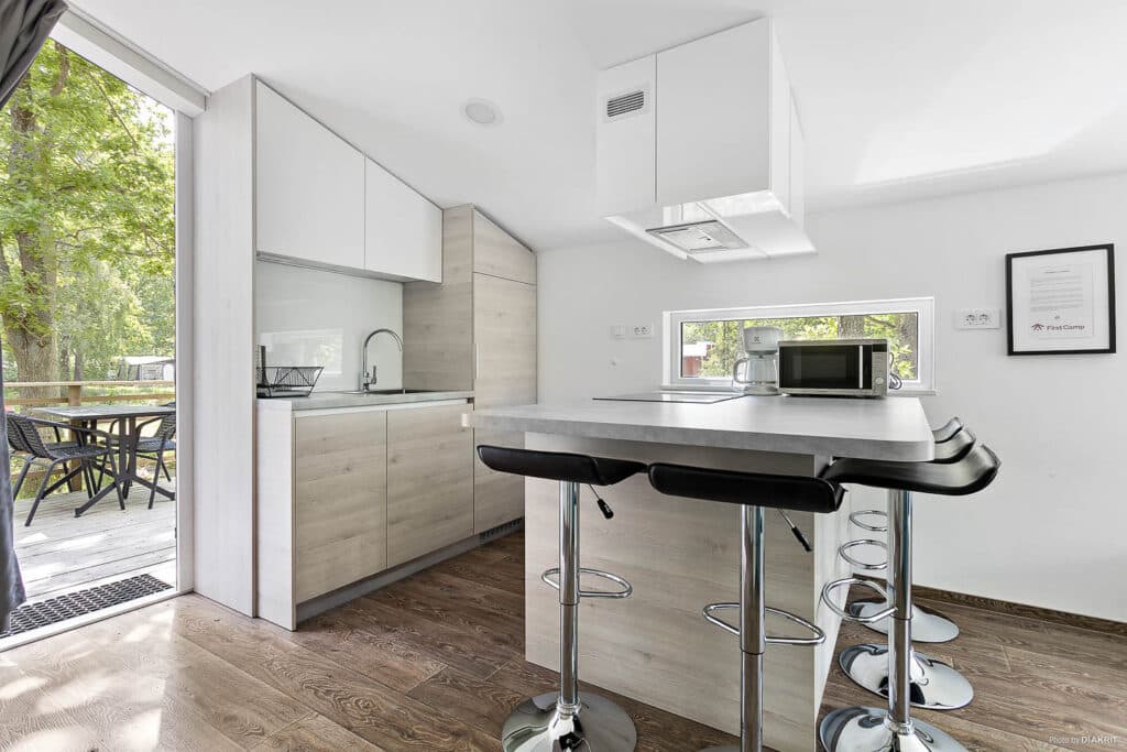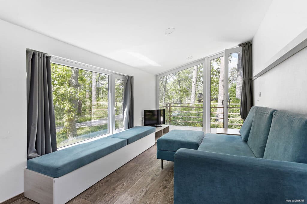 Unsere Stensöhütten breiten sich auf 45 herrliche Quadratmeter aus, mit teilweisem Blick auf das Wasser. In der Hütte können bis zu sechs Personen ihren Urlaub genießen. Die Betten sind auf zwei Schlafzimmer verteilt, eins mit zwei Einzelbetten und eins mit einem Etagenbett. Im Wohnzimmer gibt es auch ein Schlafsofa, auf dem ein bis zwei Personen eine gute Nachtruhe finden können. In der Hütte gibt es auch Fußbodenheizung, Klimaanlage, eine voll ausgestattete Küche mit allem, was Sie für ein leckeres Abendessen brauchen, und große Panoramafenster. Genießen Sie Ihren Urlaub in der Stensöhütte!