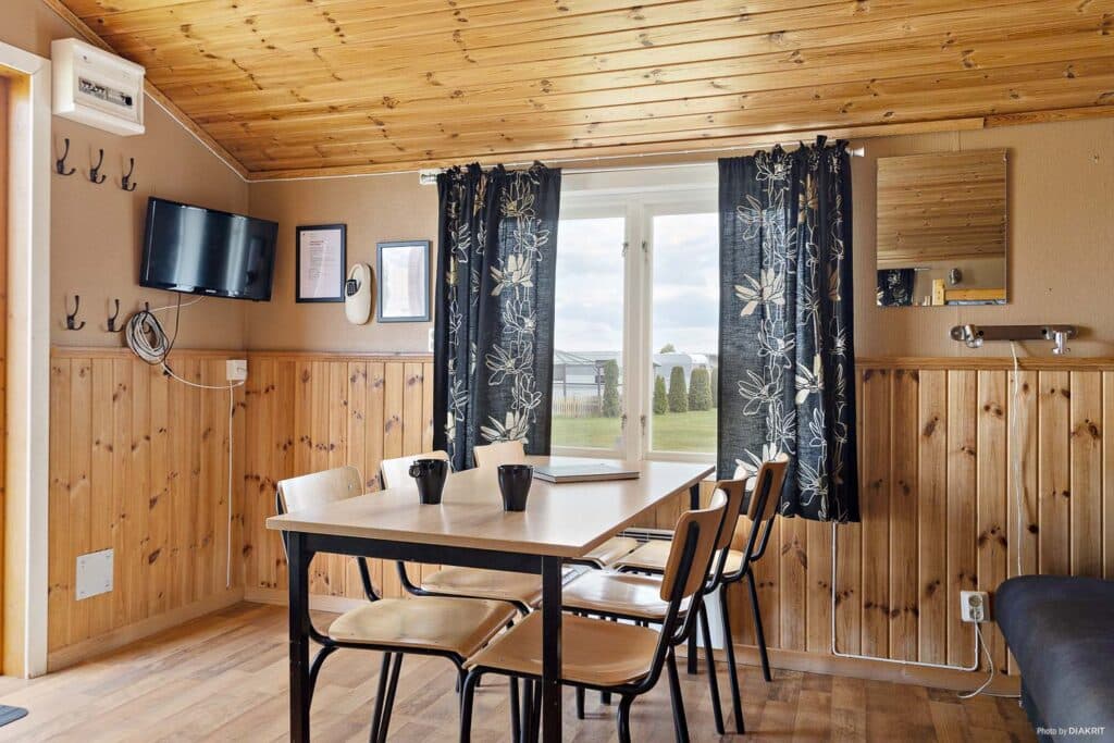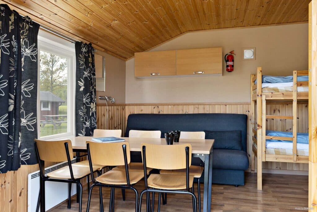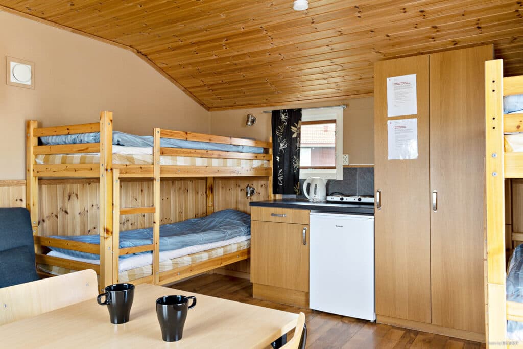 Die Frykenstuga Extra hat ein Zimmer mit 16-17 m2 und ist mit zwei Stockbetten, einem Schlafsofa sowie Stühlen und Tisch möbliert. Es gibt eine Kochnische mit Kühlschrank, Kochplatte, Wasserkocher und einfacheren Küchenutensilien sowie einem Kanister, um Wasser zu holen. Kissen und Bettdecken sind für alle Betten der Hütte vorhanden. Dusche, Toilette und Küche befinden sich im nahegelegenen Servicegebäude.