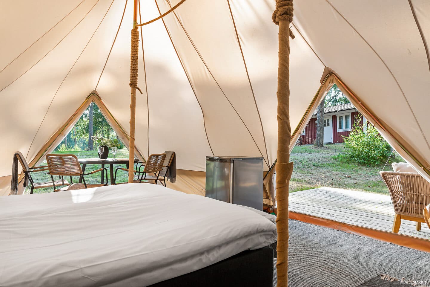 Nicht verpassen: Probieren Sie die große Neuheit dieses Jahres in Torekov aus – das Glampingzelt! Hier wohnen Sie auf 20 großzügigen Quadratmetern und genießen eine wirklich behagliche und einzigartige Unterkunft. Das Zelt bietet Platz für bis zu vier Personen. Die komfortablen Betten sorgen für ein echtes Hotelgefühl und sind in ein Doppelbett und ein Einzelbett unterteilt, das für zwei Personen ausgezogen werden kann. Das Zelt ist außerdem mit einem Kühlschrank und einem Korb mit Geschirr und Besteck für vier Personen ausgestattet. Darüber hinaus steht ein Heizlüfter zur Verfügung. Vor dem Zelt finden Sie einen gemütlichen Sitzbereich mit schönen Loungemöbeln. Bettwäsche und Handtücher sind nicht inbegriffen, können aber bei der Online-Buchung hinzugefügt werden. Perfekt für alle, die bei einem Kaffee oder einer Mahlzeit im Freien die Sommerhitze, Vogelgezwitscher und die gemütliche Umgebung genießen möchten. Bitte beachten Sie, dass es im Zelt kein fließendes Wasser gibt. Einrichtungen wie Duschen, WC und Küche finden Sie in den nahe gelegenen Servicegebäuden auf dem Gelände.