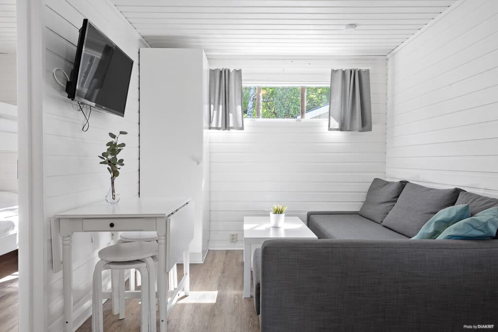 Man muss nicht groß wohnen, um es richtig schön zu haben! In unseren gemütlichen Sandhamn-Hütten mit 17 m² gibt es einen hellen und einladenden Wohnraum, kombiniert mit Kochnische und Essbereich. Zwei Personen schlafen bequem im Etagenbett im Schlafzimmer (ohne Leiter und Sicherheitskante) und zwei weitere auf dem Sofa im Wohnzimmer, das auch mit einem Fernseher ausgestattet ist. Die Mahlzeiten können in der Kochnische zubereitet werden, die mit Herd, Mikrowelle und Kühlschrank ausgestattet ist. Im Badezimmer stehen Dusche und WC zur Verfügung. Am Abend ist es besonders entspannend, sich auf der Terrasse niederzulassen und zu beobachten, wie die Sonne über der Tylöbucht untergeht. Parkplätze befinden sich direkt an der Hütte.